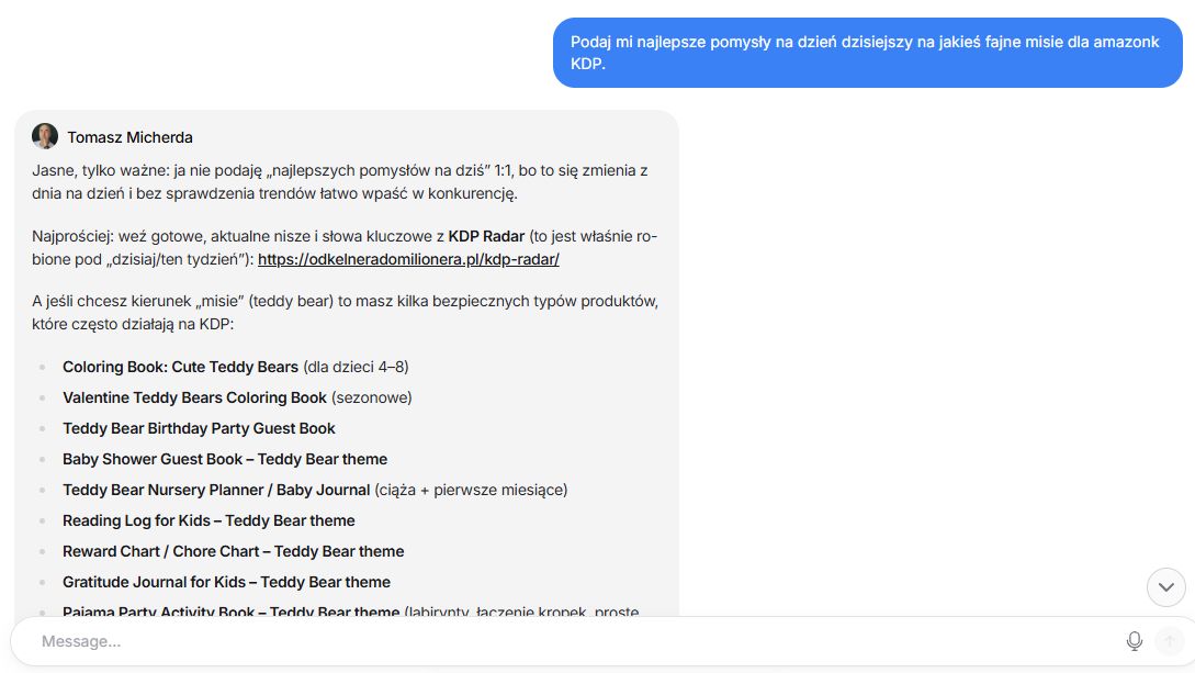 W module "Asystent AI dla Amazon KDP" otrzymujesz możliwość korzystania za darmo z najnowszego modelu AI od ChatGPT, który jest wytrenowany przeze mnie pod kątem sprzedaży na Amazon KDP.