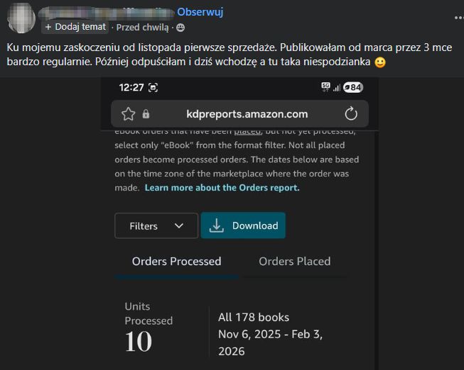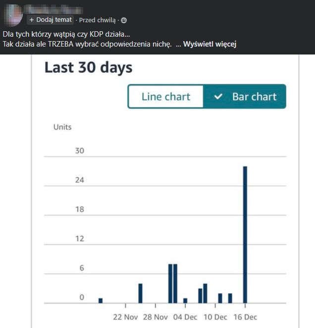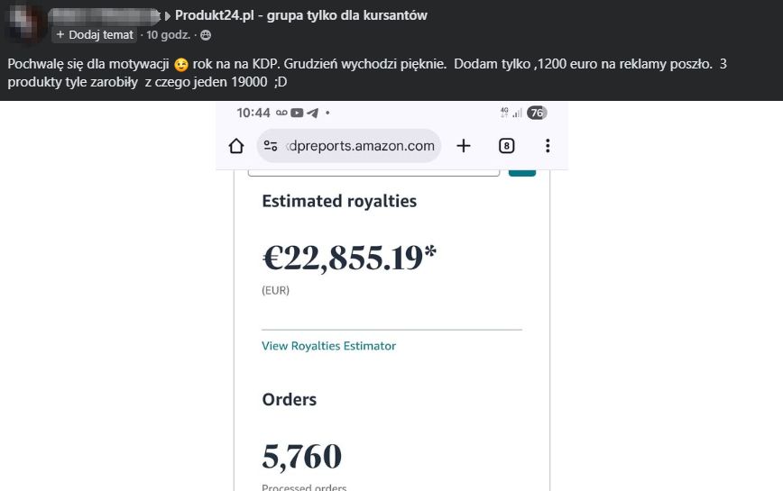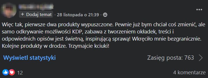 Szczerze polecam kurs Tomka Produkt 24h. Tytuł jest adekwatny do zawartości. Za bardzo przystępną cenę otrzymujemy porcję podstawowych informacji na temat tego biznesu, od procesu rejestracji na KDP do pierwszej publikacji. Kurs spełnia swoje zadanie i co ważniejsze jest inspiracją do poszerzania wiedzy. Niezwykle pomocna jest także "grupa wsparcia" na Facebooku, do której otrzymujemy dostęp po zakupie kursu. Kopalnia wiedzy, pomysłów, porad i źródło motywacji.