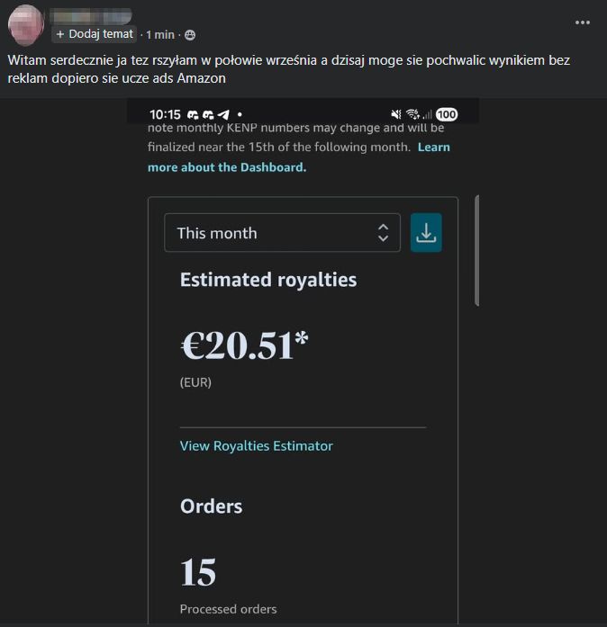 Miesiąc temu zakupiłem kurs Amazon Produkt24 i zacząłem robić swoje pierwsze produkty. Kurs zawierał wszystkie informacje potrzebne, aby zacząć biznes z KDP. Nie ukrywam, że moim celem było głównie zarabianie, ale tworzenie i projektowanie zaczęło mi również sprawiać frajdę. Jestem bardzo zadowolony z kursu i była świetna decyzja dla osoby, która nie korzystała wcześniej z Amazona.