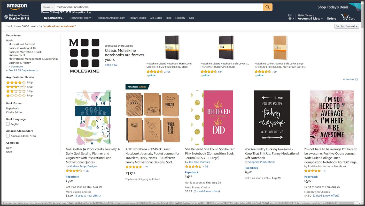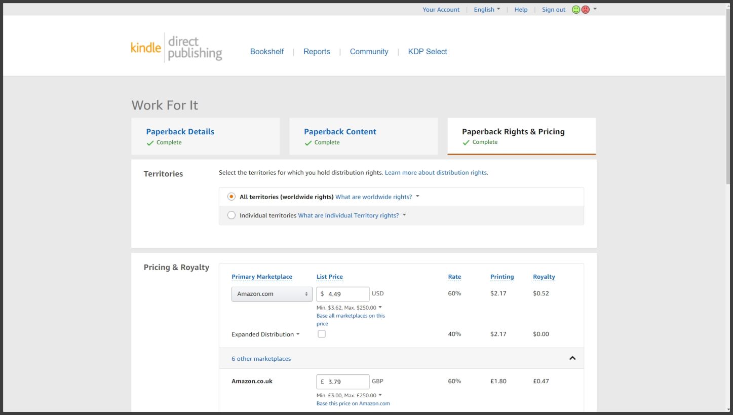 Jakie są zasady sprzedaży na Amazon w przypadku książek papierowych? Takie same. Aby sprzedawać książki papierowe musimy podobnie jak w przypadku eBooka stworzyć książkę w wersji cyfrowej na Kindle Direct Publishing, czyli dodać treść (plik np. w Wordzie), okładkę, opis produktu oraz kilka innych detali. Po zatwierdzeniu nasza książka pojawia się również na Amazon.com oraz na innych rynkach światowych.