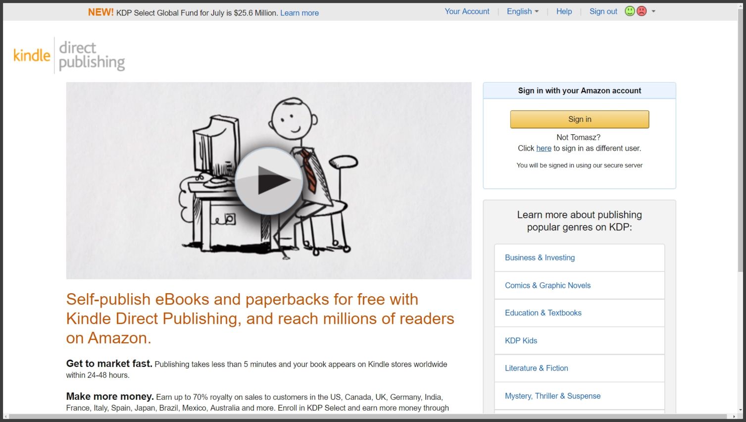 Należy zarejestrować się na portalu Kindle Direct Publishing. Jest to portal dla wydawców książek papierowych i eBooków. Rejestracja na tej platformie jest darmowa i Amazon zarabia pobierając prowizję od naszych sprzedanych książek lub eBooków.
